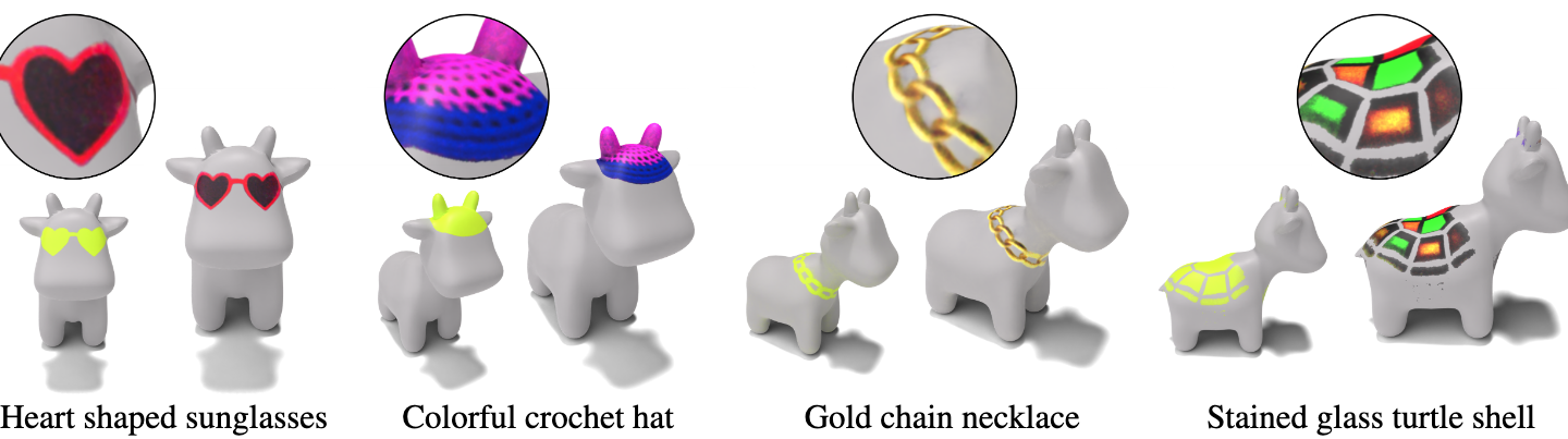Key to the method, the localization and stylization are learned simultaneously, interacting with each other to improve both the sharpness of the localization and the details of the edit. By employing this synergistic approach alongside CSD, 3D Paintbrush is able to achieve new levels of detail using different text prompts on a diverse group of 3D objects. When asked to place a Barcelona jersey on a Lego humanoid, 3D Paintbrush not only accurately locates the torso area to color the jersey, but also accurately synthesizes the crest, down to the golden football and the red “plus” sign. 3D Paintbrush is also not limited to “plausible” or realistic edits. Though no one has seen shin guards on a giraffe or a cow with a turtle shell, 3D Paintbrush can place both of those in their respective locations with a high degree of precision.
